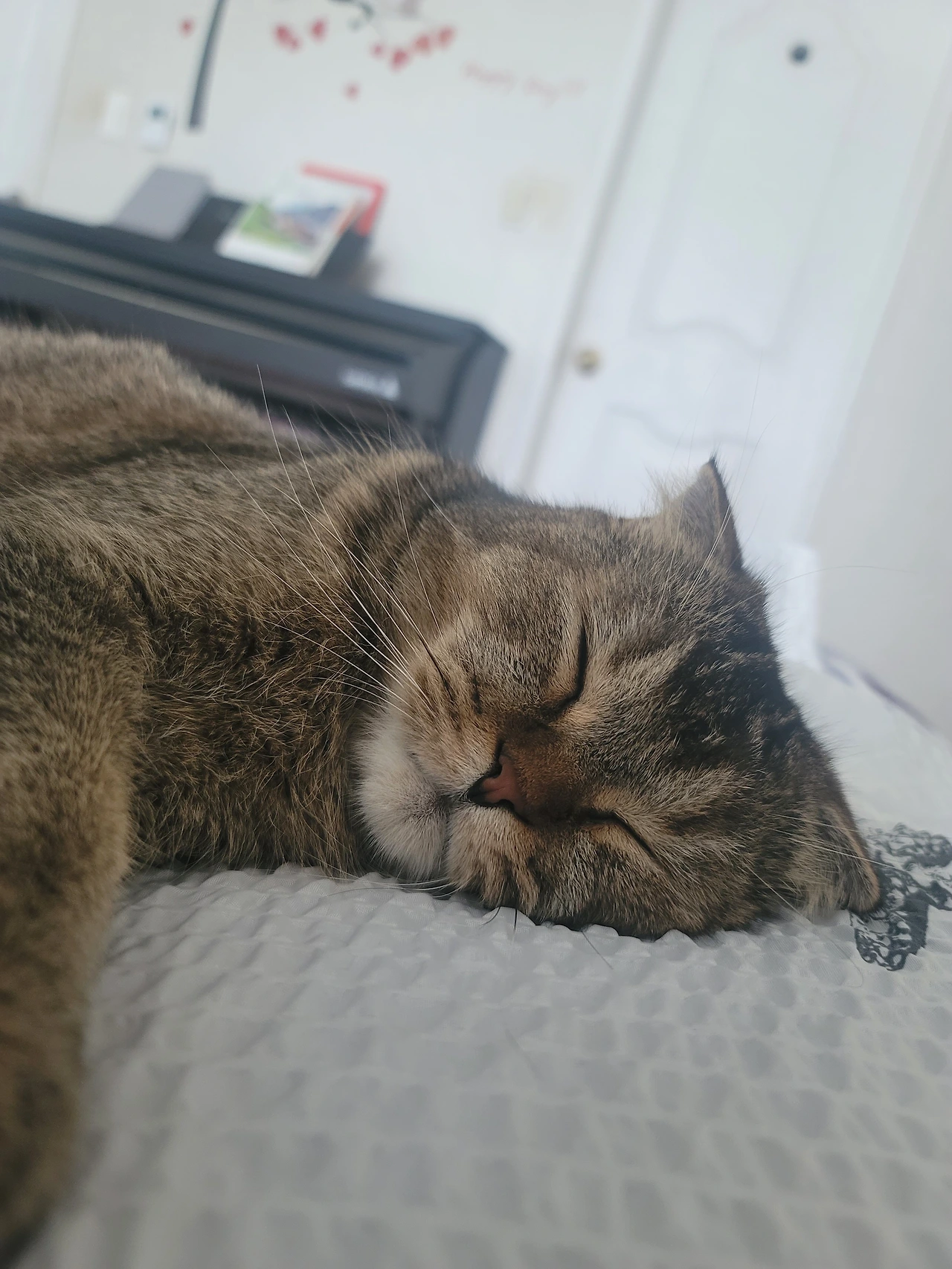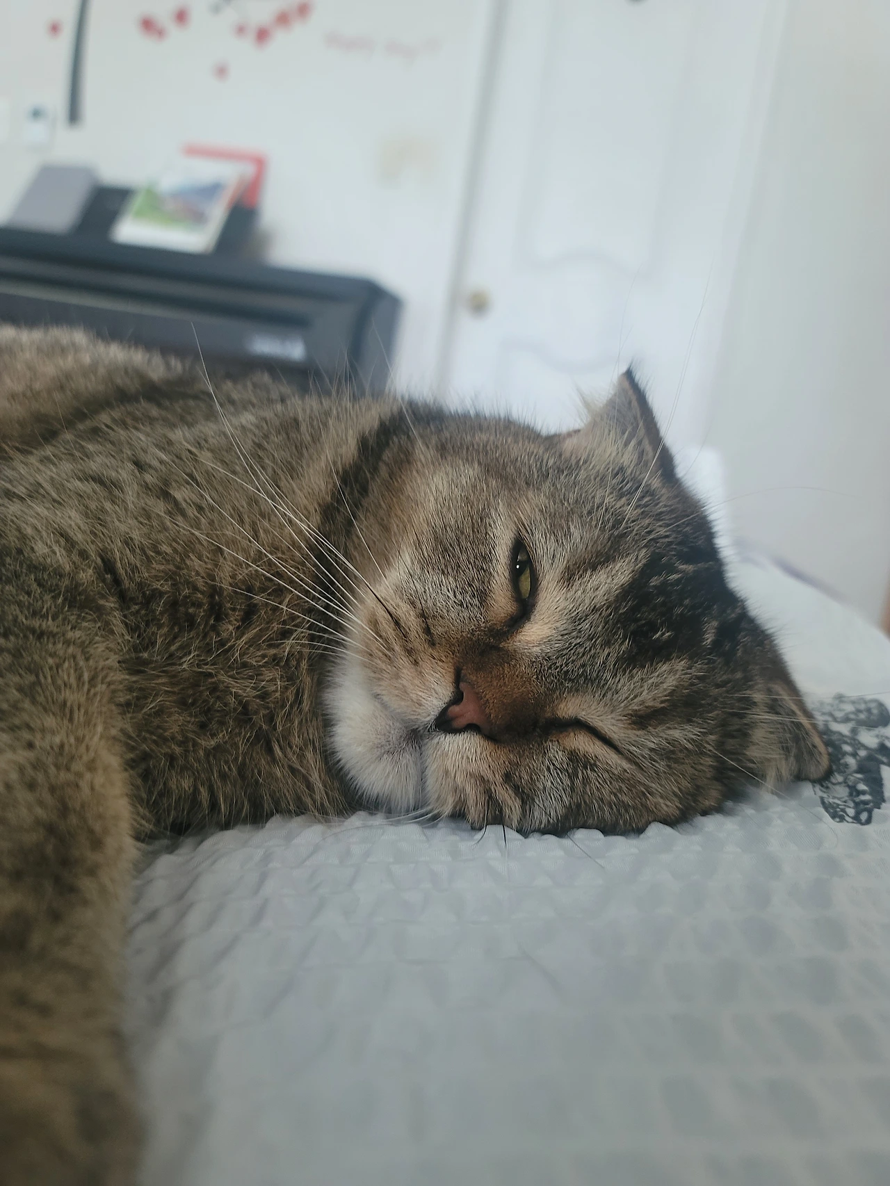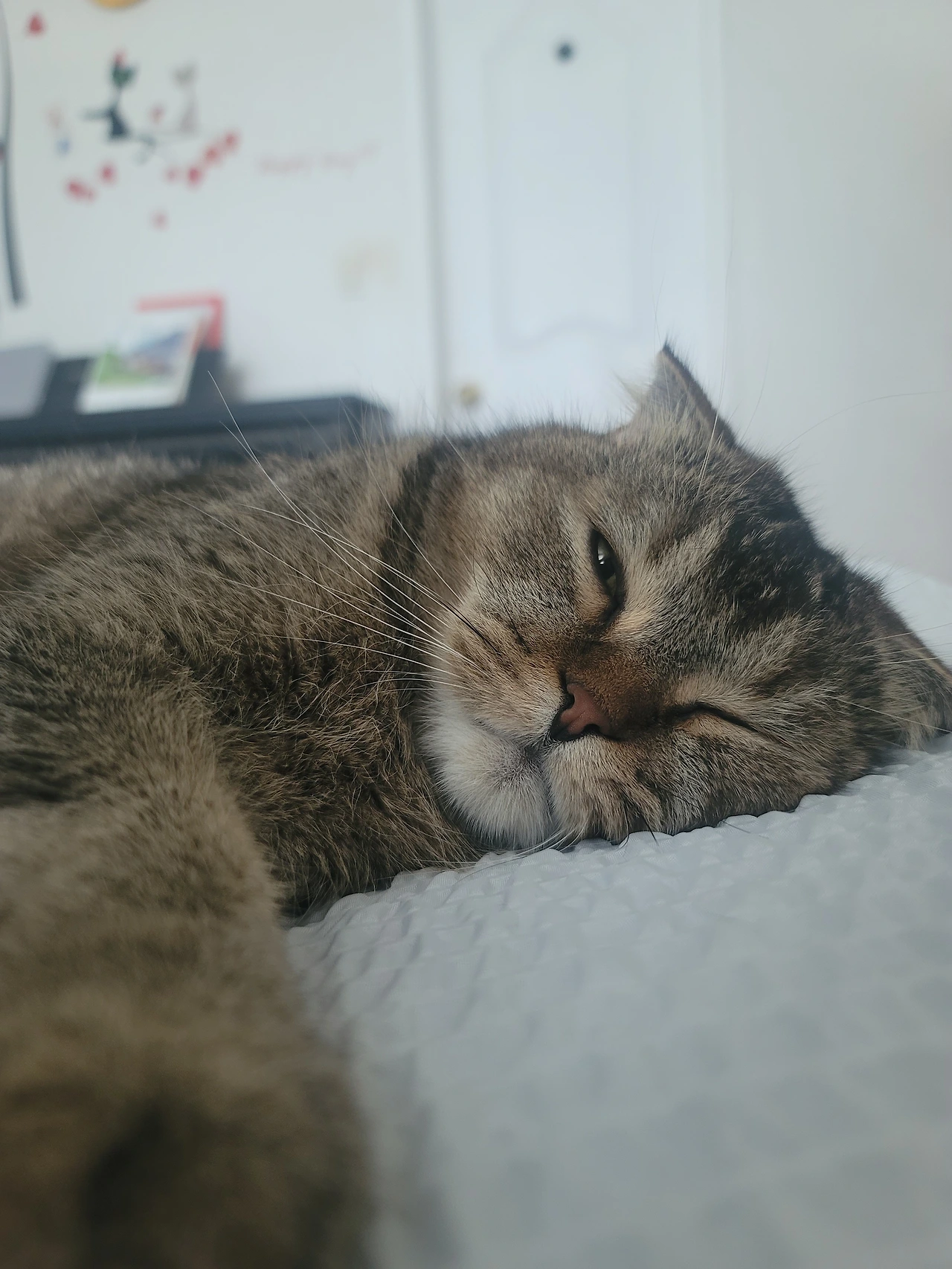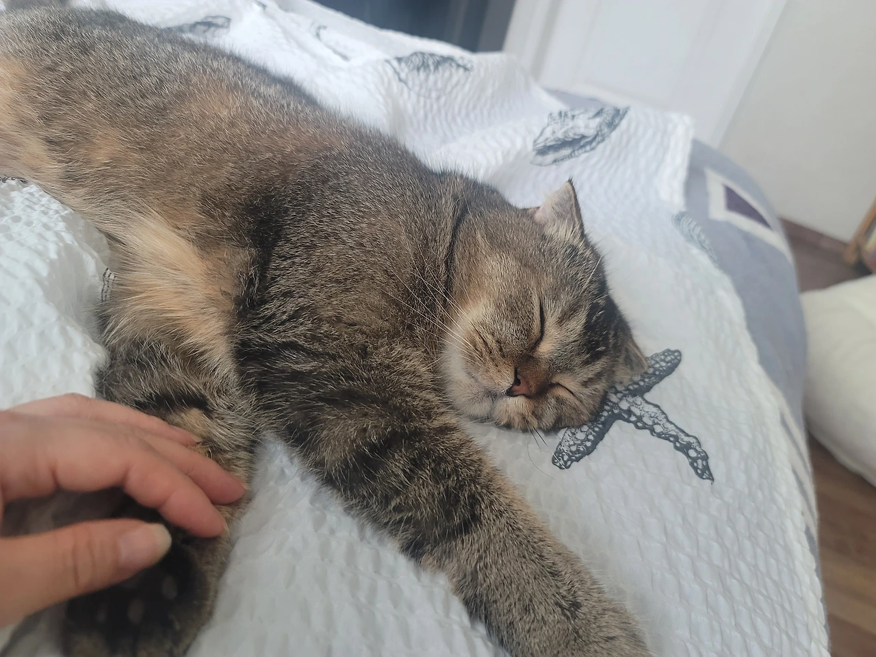 이제 동생이 생겨버린 온이에게 혼자만의 시간이 필요할 때가 있다. 뭐 수시 때때로이기도 하지만, 적어도 아침나절에 조용히 나의 침대 위에 올라와서 자리를 잡고 누워 버렸다. 여름이라 꺼내 놓은 홑이불의 시원함이 기분 좋은지 일찍이도 나를 깨우고 한자리 차지해 버렸다. 가로로 누워있는 바람에 나도 그 옆에 스리슬쩍 누워본다.