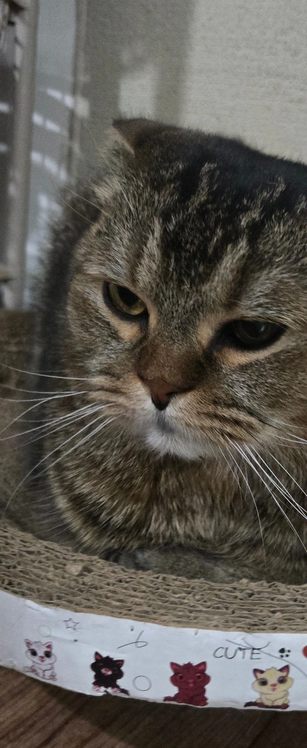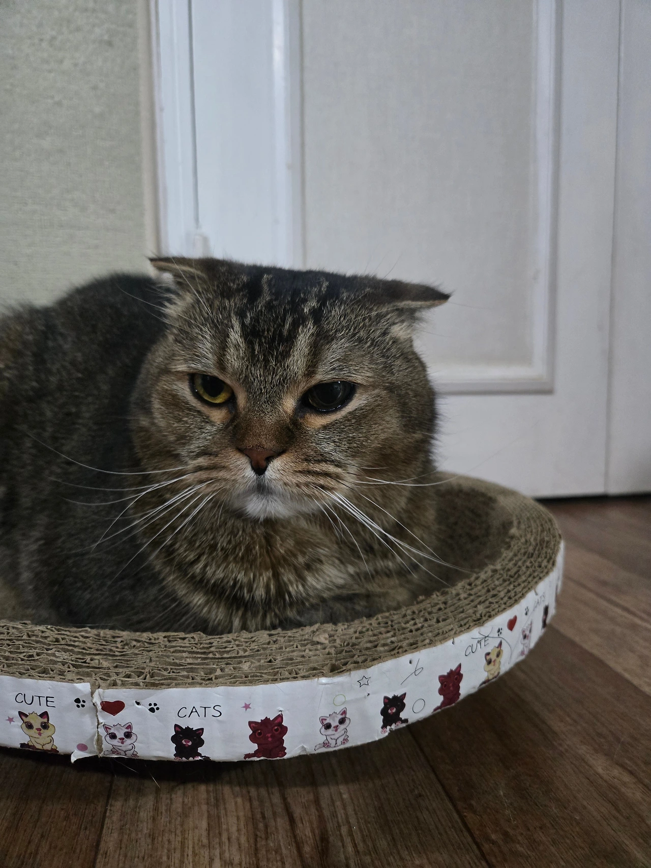 골판지 침대 위에 몸을 가지런히 접고 앉아
