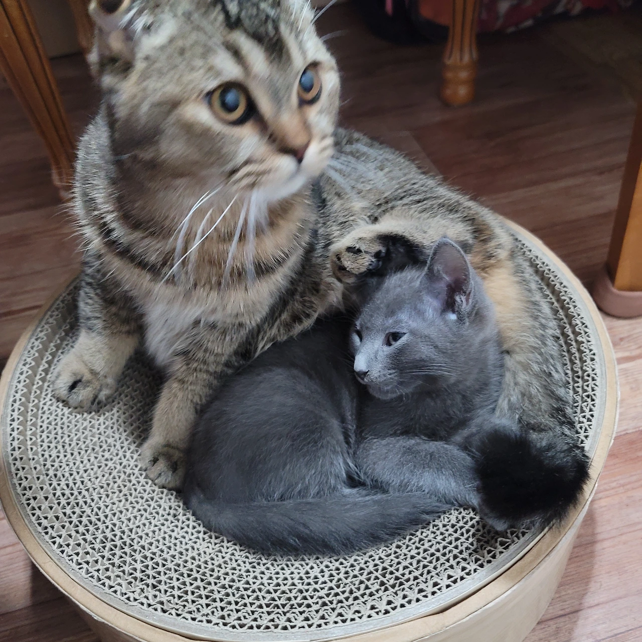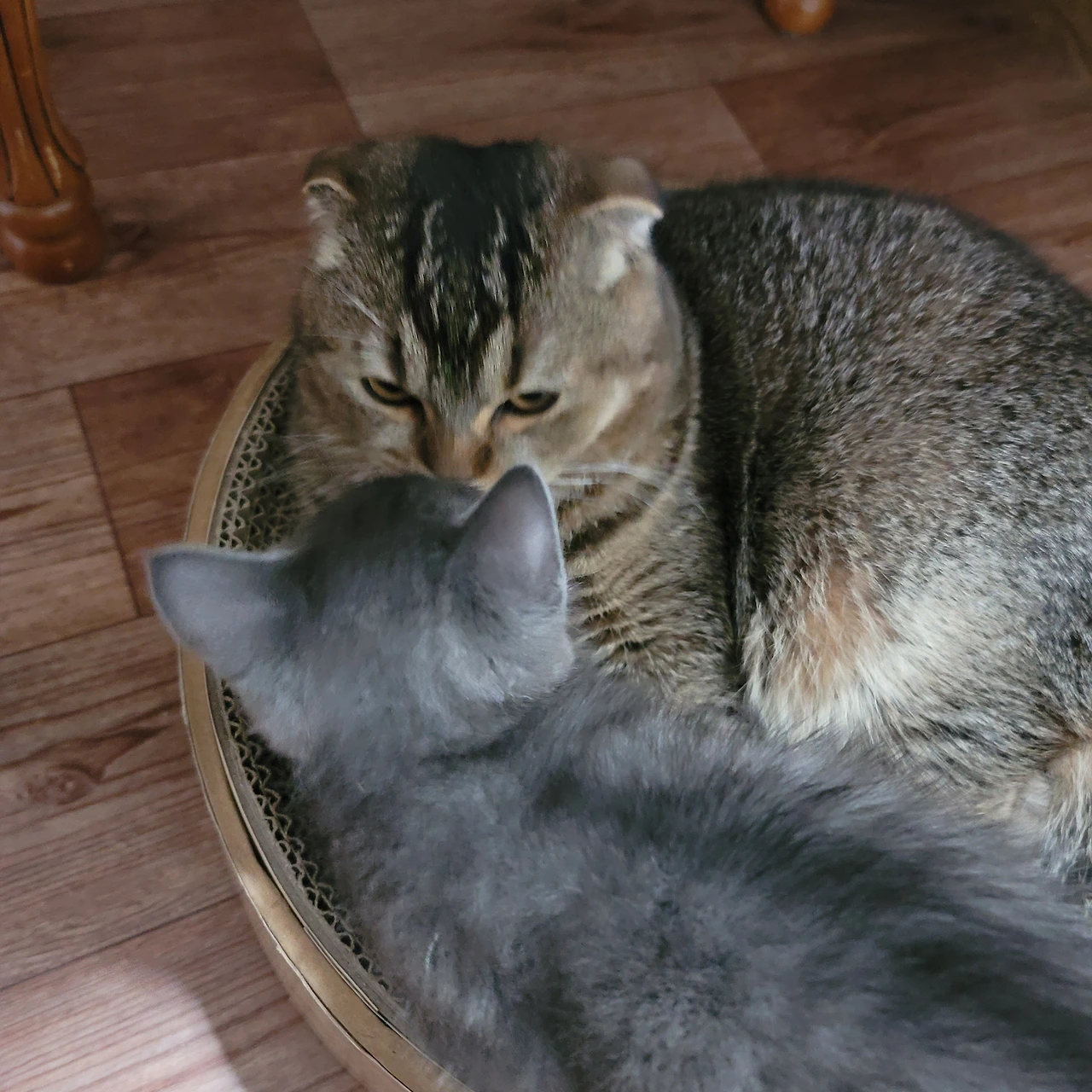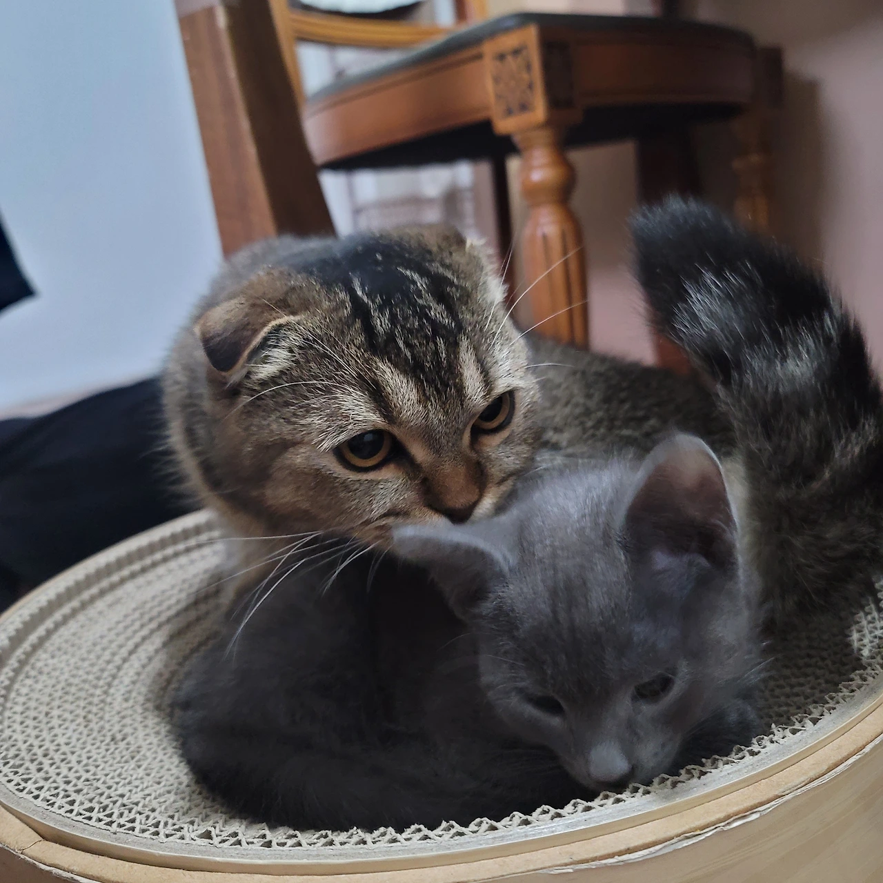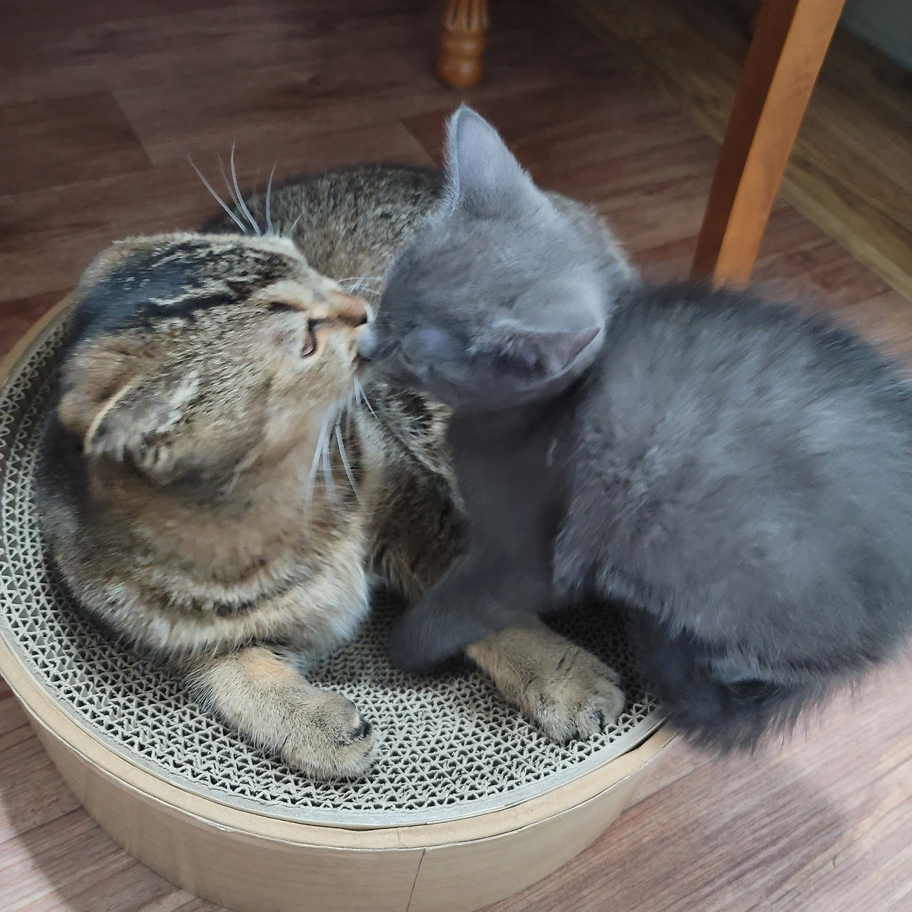 자기의 반밖에 되지 않는 아기 고양이가 신기한 것인지 귀여운 것인지 연신 쳐다보며 혼자 들어가도 가득 차는 자신의 스크레쳐 의자의 한켠을 내어줍니다.