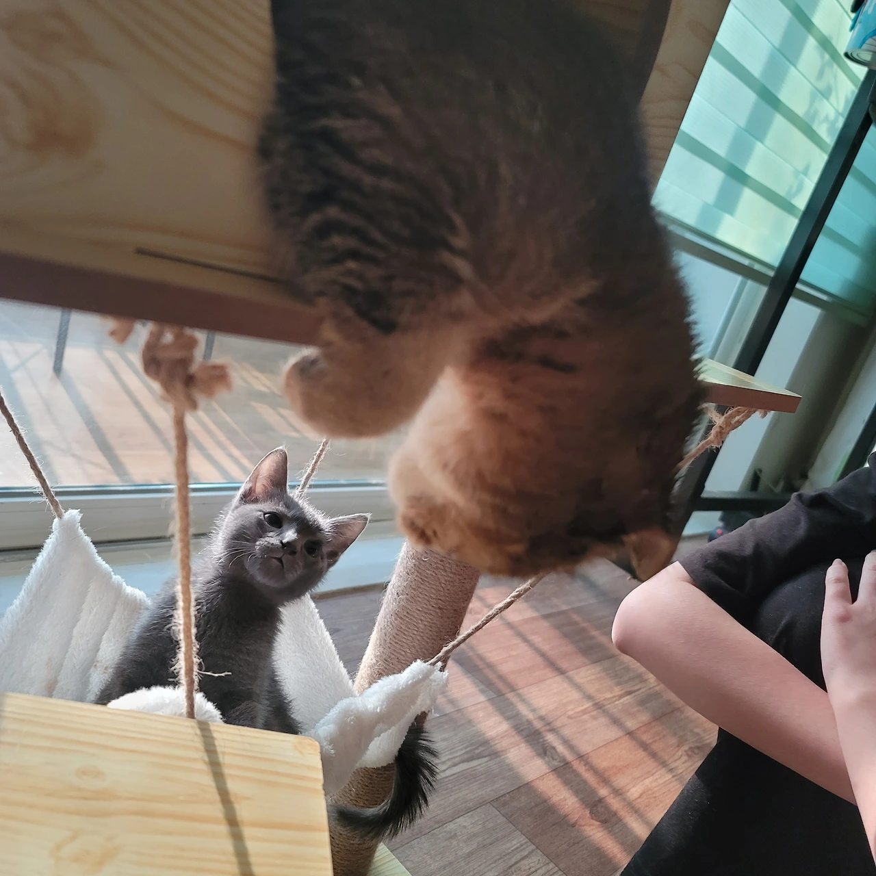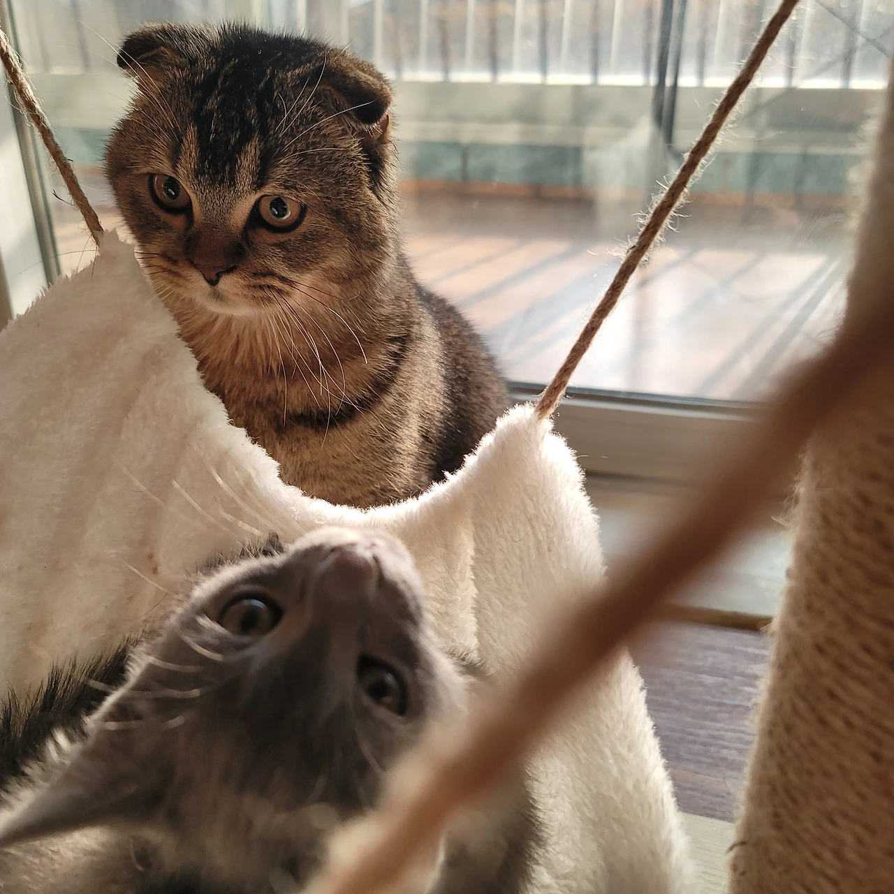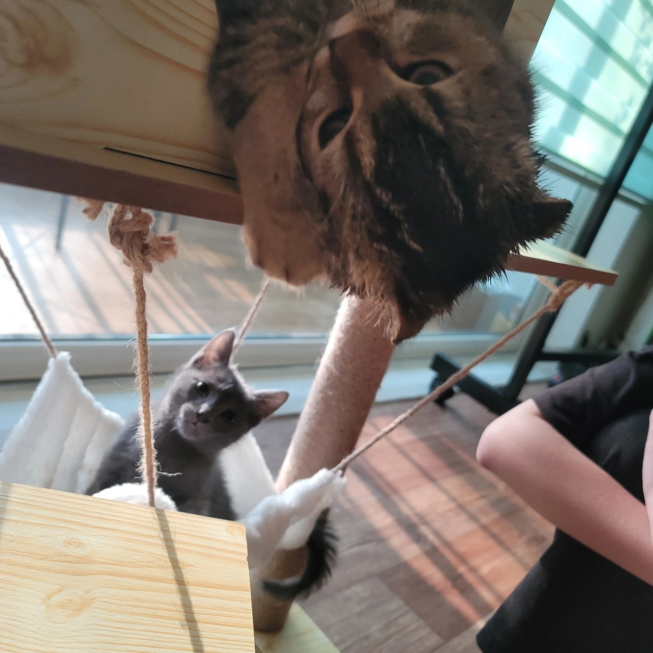 가장 좋아하는 캣타워의 한 번도 사용하지 않은 부분도 내어주었습니다. 그리고 아깽이가 위험하지는 않은지 잘 보살펴 주고 있는 모습은 아이를 보살피는 어른의 모습과 겹쳐 보이기까지 합니다.