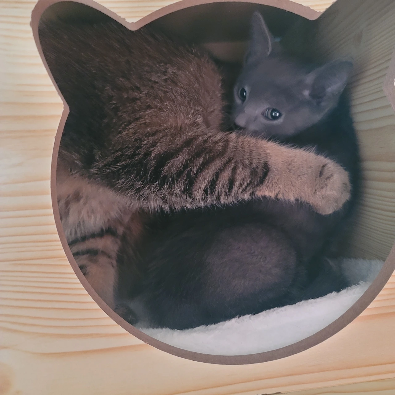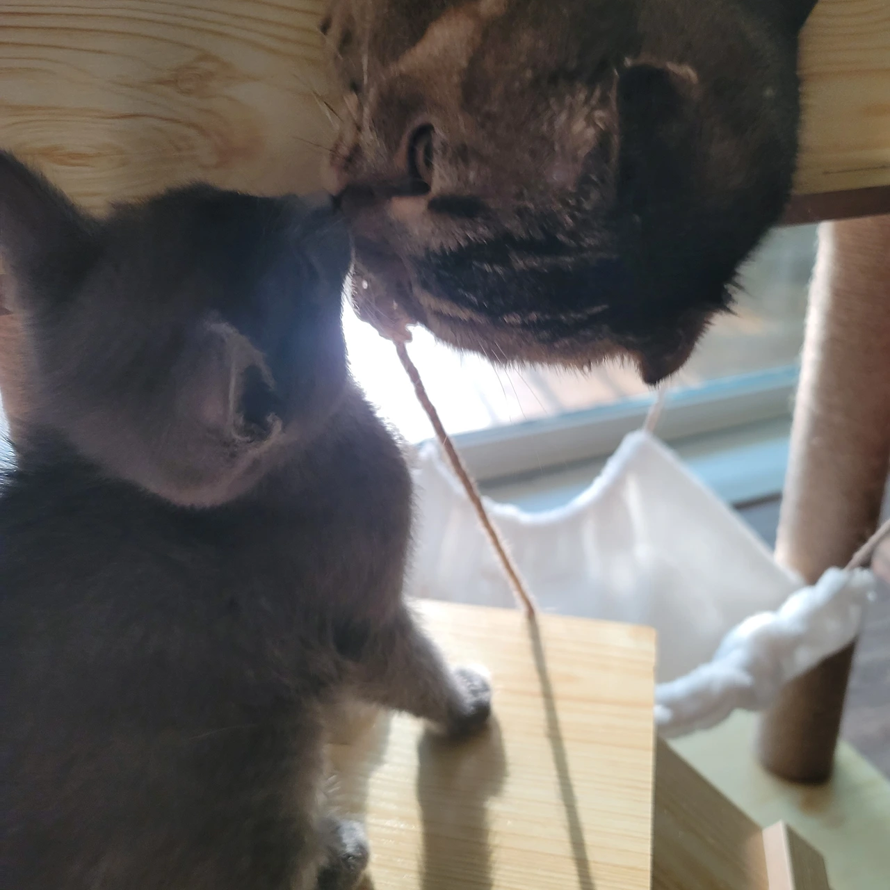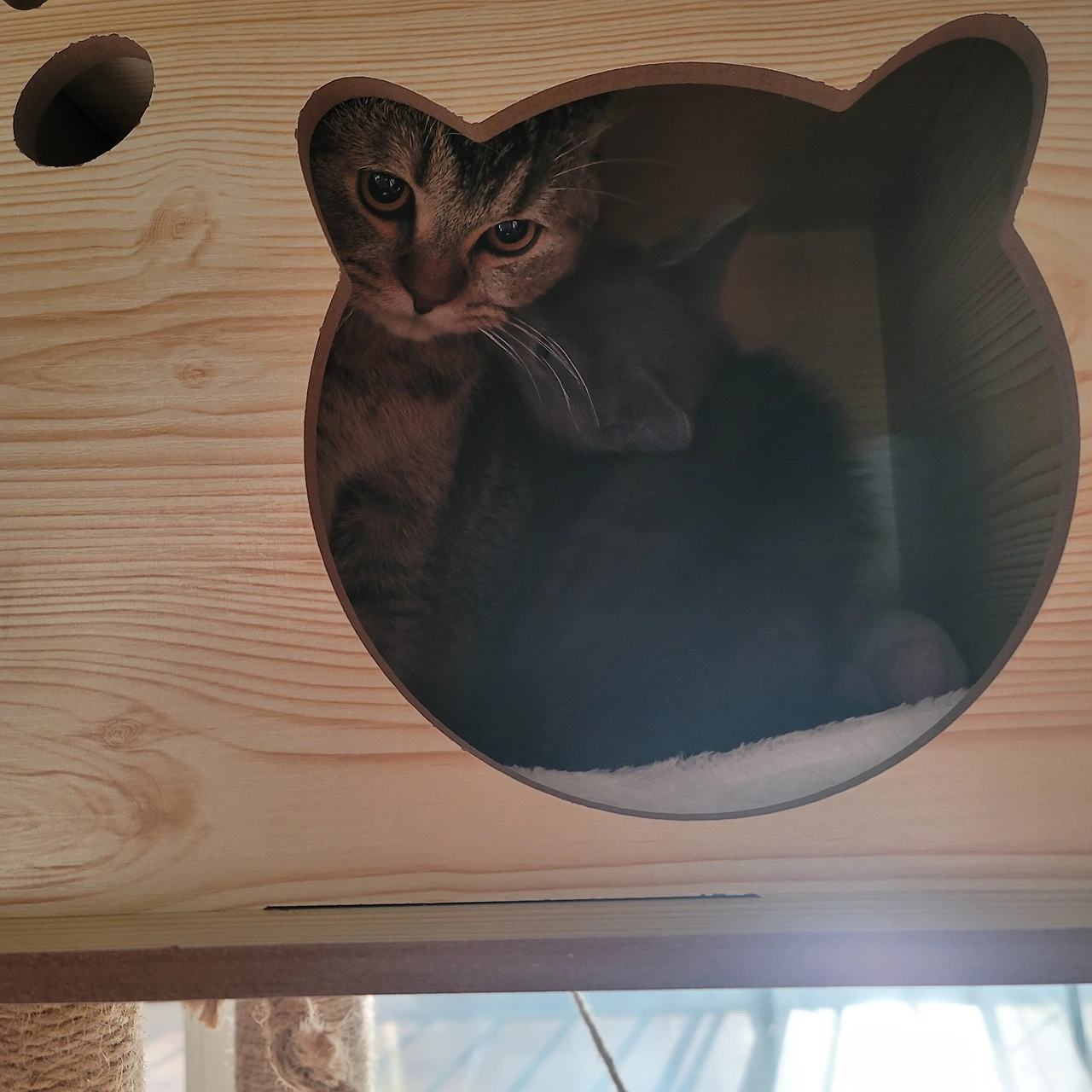 가장 좋아하는 캣타워의 한 번도 사용하지 않은 부분도 내어주었습니다. 그리고 아깽이가 위험하지는 않은지 잘 보살펴 주고 있는 모습은 아이를 보살피는 어른의 모습과 겹쳐 보이기까지 합니다.