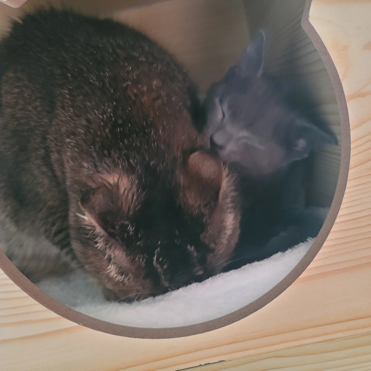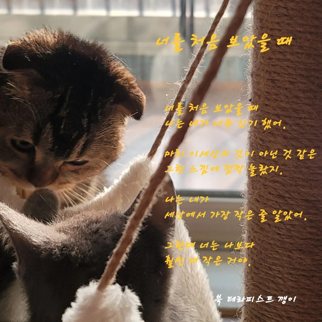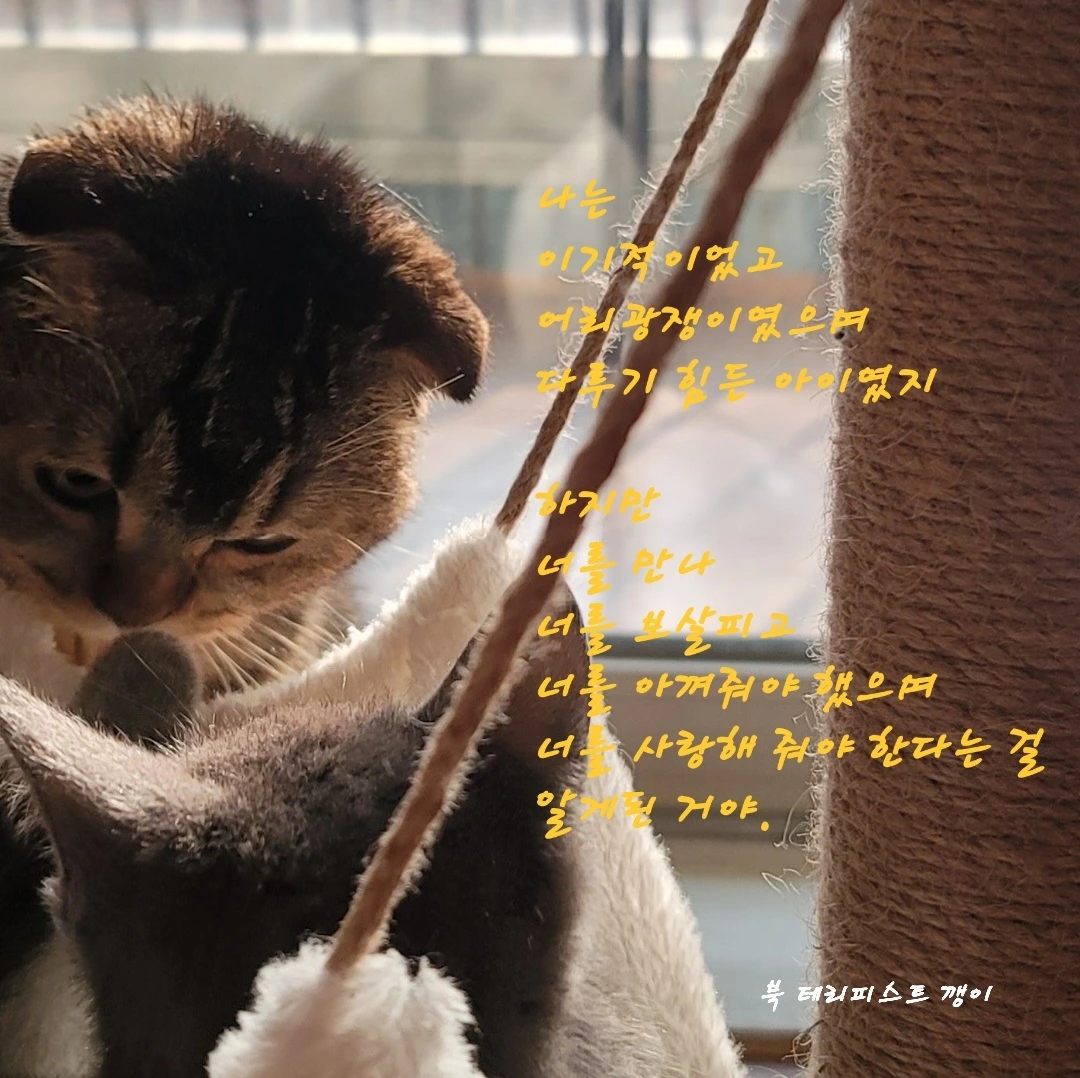 막내였던 고양이 온이가 자기보다 어린 아깽이를 아끼며 자신의 것을 쉽게 내어주는 것을 보니 괜스레 제가 다 뿌듯하더라고요.