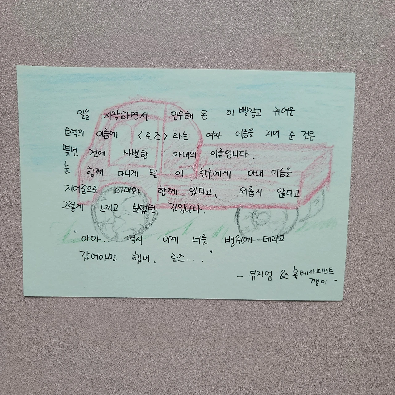 일을 시작하면서 인수해 온 이 빨갛고 귀여운 트럭의 이름에 <로즈>라는 여자 이름을 지어 준 것은 몇 년 전에 사별한 아내의 이름입니다. 늘 함께 다니게 될 이 친구에게 아내 이름을 지어준 것은 평생을 사랑했던 아내 로즈와 계속 함께 있다고, 외롭지 않다고 그렇게 느끼고 싶었기 때문입니다.