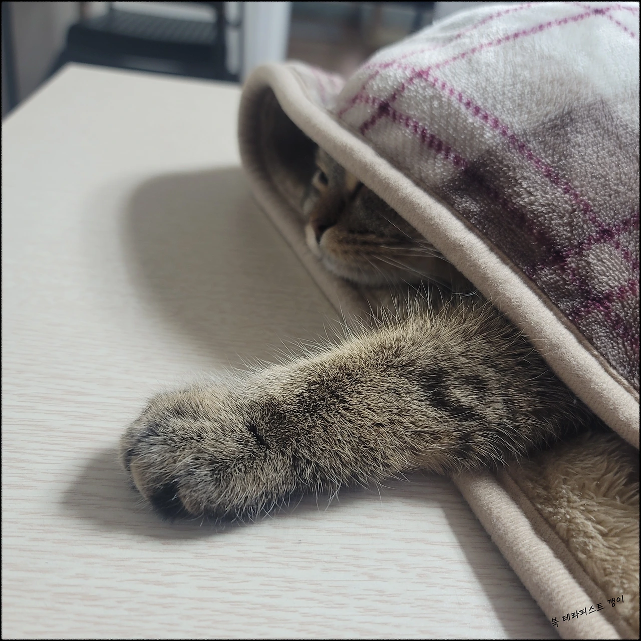 어느 날 집에 돌아와 "아들~~ 잘 있었니?" 하며 온이를 찾았는데요. 아무리 봐도 온이가 없는 겁니다. 그리 넓지도 않은 우리 집이기에 온이가 있는 곳은 꽤나 한정적인데요. 거실의 숨숨집이나, 안방 창고로 쓰고 있는 화장실속, 베란다 한 구석에 있는 의자 위가 온이가 좋아하는 장소입니다만 그 어디에도 온이가 없는 것입니다. 혼자 씩씩대며 온이를 찾다가 결국 포기하고 편한 옷으로 갈아입고 책상 위에 앉았는데, 옆 캣타워 가장 위칸에서 시선이 느껴지는 것입니다. 온이는 그 위에서 혼자 난리난리를 하면서 자신을 찾는 엄마를 그저 흥미롭게 바라보고 있었던 거죠.. 에효..