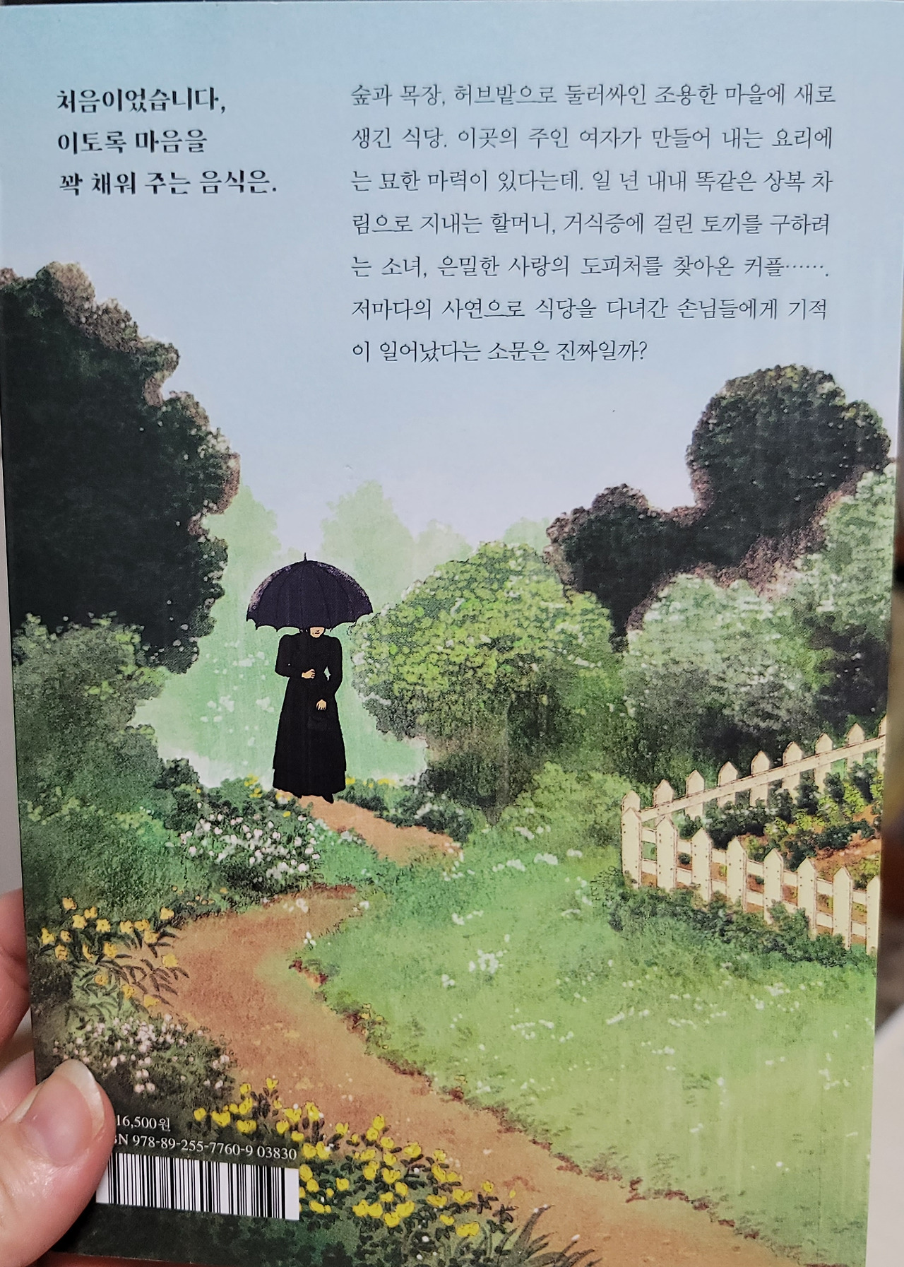 뒤표지를 보니 이 식당을 향해 다가오는 손님이 한분 걸어오고 계시네요~ 머리부터 발끝까지 검은색으로 둘러싸인 이 분께는 어떤 사연이 있는지 벌써부터 궁금해집니다.