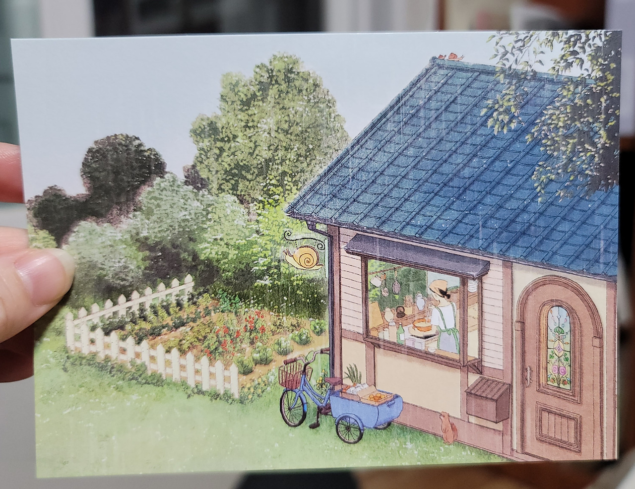 펼쳐 보니 엽서가 한 장 들어있습니다. 비가 내리는 음식점 주변을 찬찬히 살펴보면 그야말로 너무나 귀여운 손님들이 보이네요~ 살짝 보면 그냥 지나갈 것만 같은 작은 손님들이 문 옆과 지붕에도 있습니다.