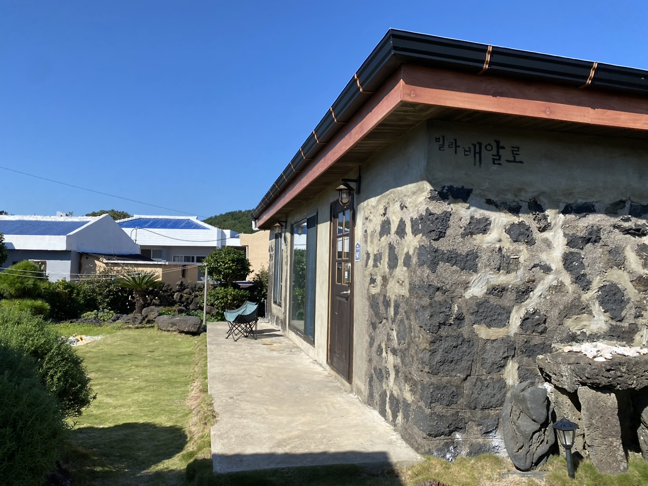 마당이 예쁜 빌라배알로. 처음엔 여기 마당에서 걸음마 연습하는 상상을 하며 예약했었는데 생각보다 바람이 많이 불어서 마당은 거의 못 즐겼다. 그렇지만 커다란 유리창 너머 보이는 아기자기한 마당이 제주살이를 실감케 해주었다.