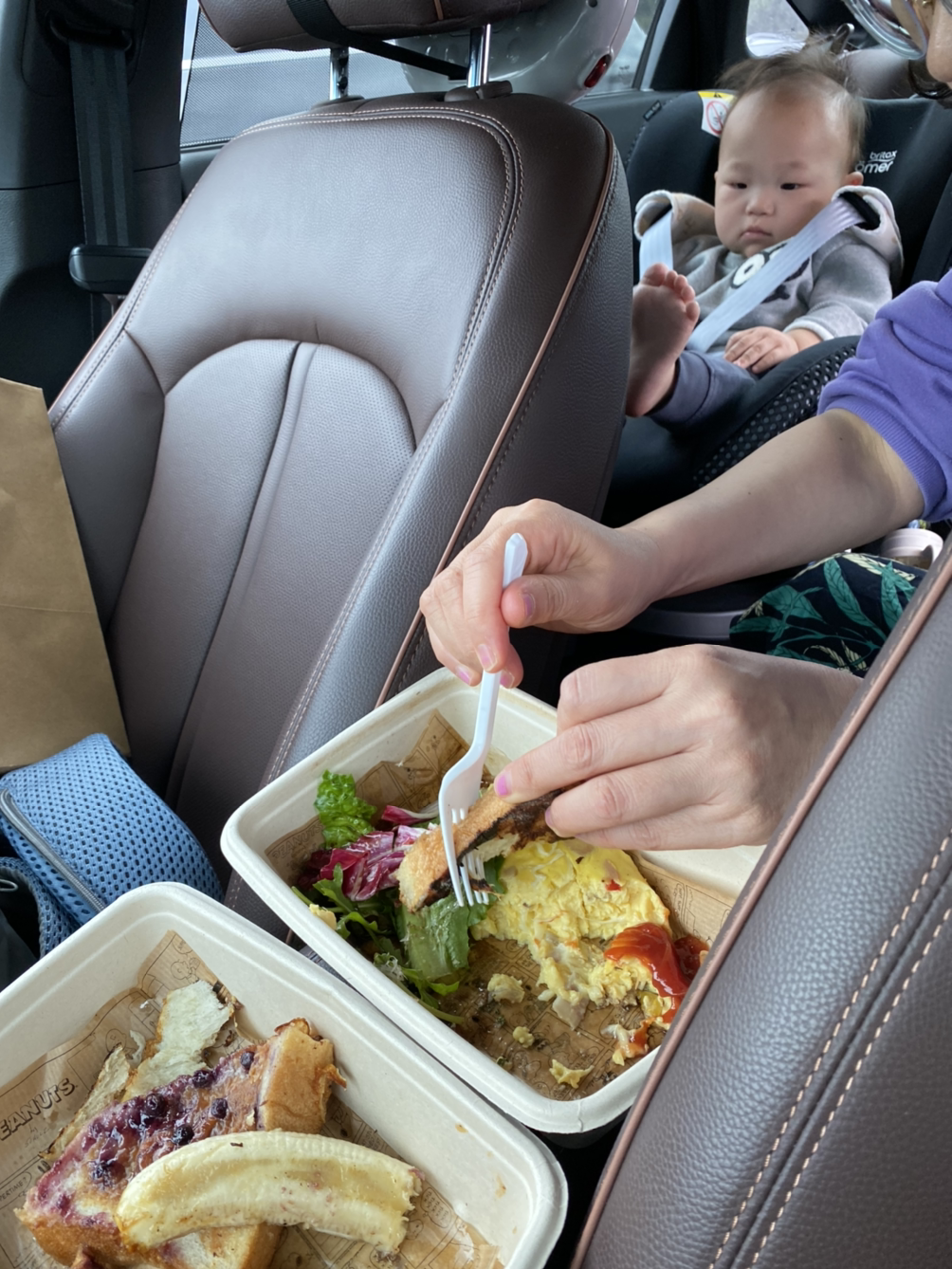 아기가 카시트에서 자는 동안 스누피 카페에 가서 점심 먹을 것을 테이크아웃했다. 아기자기하고 깔끔한 스누피 카페. 오전 시간대라 사람도 없어 더 좋았다. 이렇게 좋은 자리를 놔두고 차에서 허겁지겁 먹어 치우는 아기와의 여행.