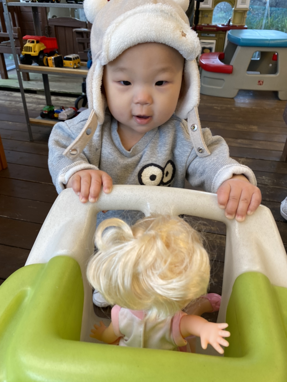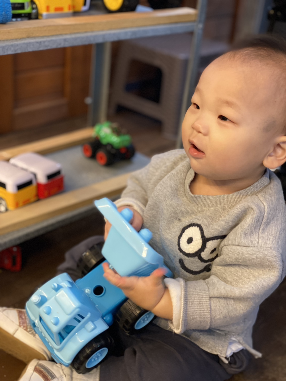 미로에서 나오면 있었던 야외놀이터에서 인생 11개월 만에 첫 그네에 입문했다. 왜 이렇게 귀엽니… 주방놀이와 자동차, 공룡이 가득한 실내 놀이터도 있다. 걸음마 연습도 하고 카트도 끌고 돌아다니고 자동차도 이것저것 만져보고 알차게 놀았다. 그러고 보면 청소기에 자동차에 카트에… 딸 같은 아들로 키우고 싶었는데 이 녀석의 취향은 너무나도 아들 같은 아들이다.