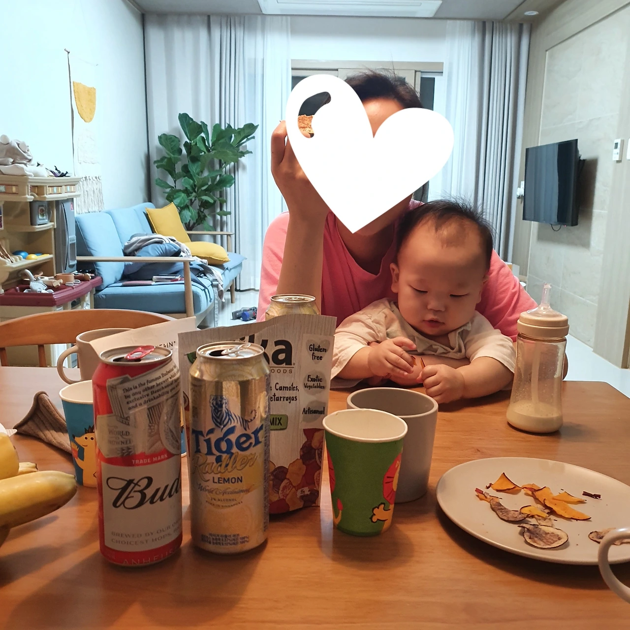 얼른 육퇴 하고 맥주 마시고 싶은데 육퇴를 안 시켜주길래 그냥 맥주부터 마셨다. 아기는 분유를, 나와 친구는 맥주를! 야채칩 안주는 나눠먹었다.