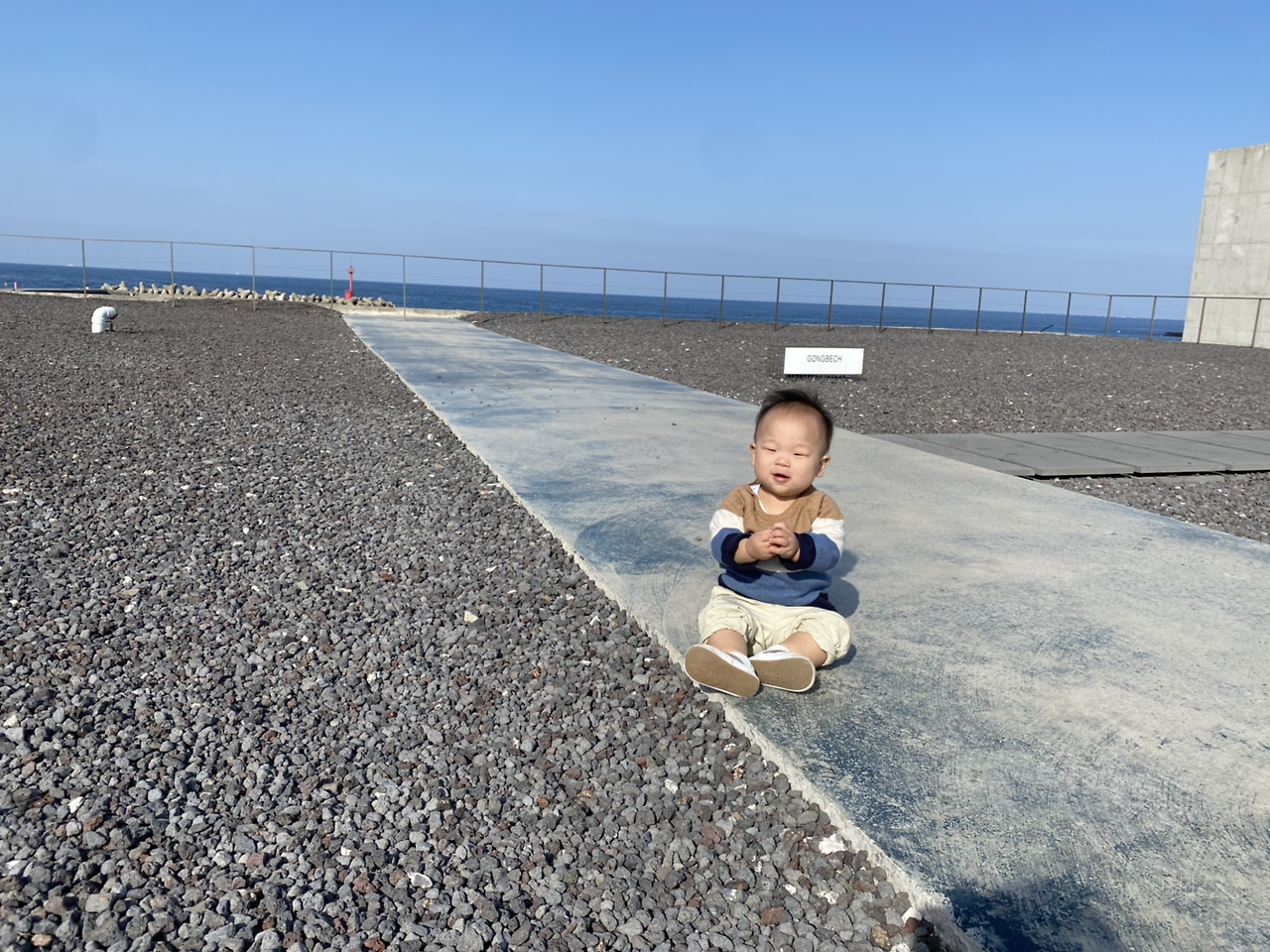 있는 닭머르 전망대에 가기 최적의 날씨다. 아기띠를 깜빡하고 놓고 왔지만 사진에 보이는 게 전부일 정도로 짧은 데크길이니 쉽게 갔다 올 줄 알았다. 큰 오산이었다. 아기는 안겨있으려 하지 않고 (걷지도 못하는 주제에) 계속 내려달라고 뻗댔고, 엄마는 어째서인지 도와줄 생각이 전혀 없어 보였다. 결국 내내 허리를 구부려 아가 양손을 잡고 걸음마를 도와주고, 계단마다 들어 올리고 내리며 전망대를 왕복했다. 날이 좋으면 뭐하나. 힘들어 죽겠는데.