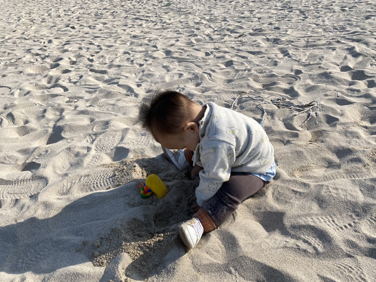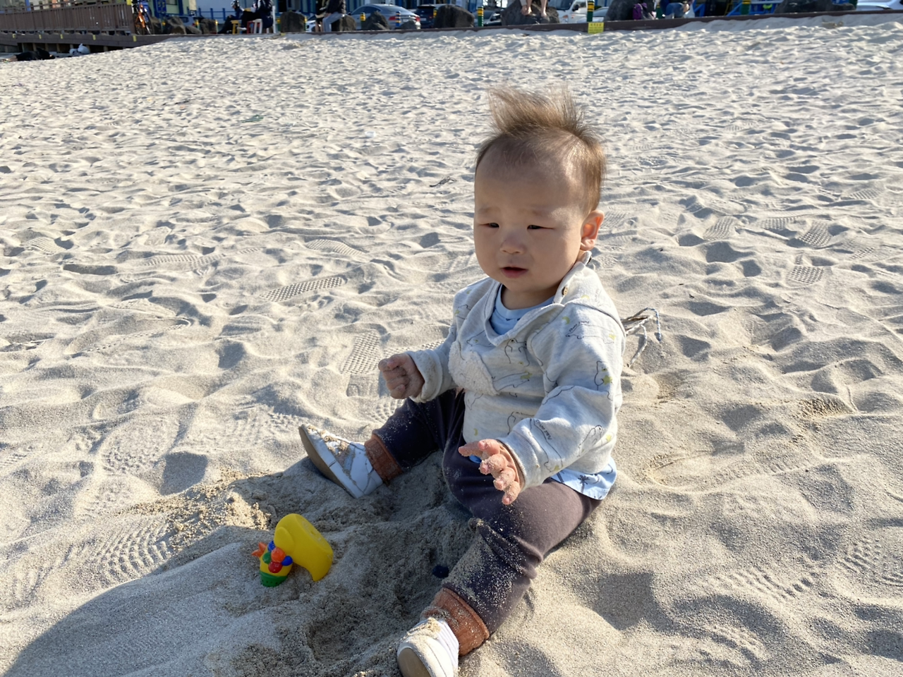 해변에서 걸음마 연습을 하다 주저앉아버린 아기, 그대로 모래놀이에 입문했다. 우리 먹보 아기 또 흙 퍼먹을까 봐 조마조마했는데 안 먹는 걸 보고 이제 사리분별이 좀 되는 걸까 싶었다.