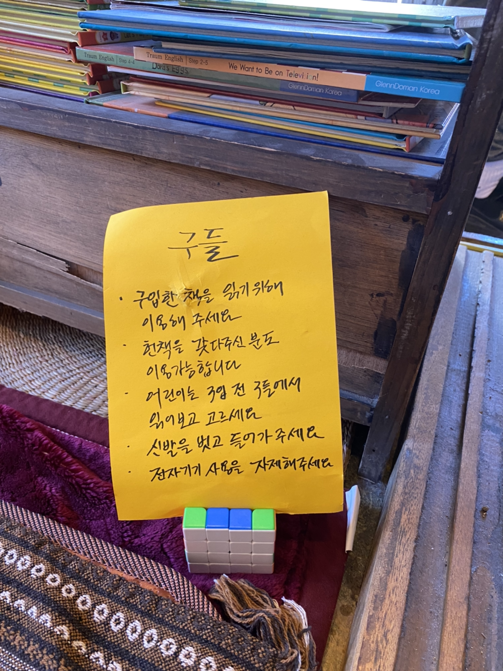 이곳이 인기 있는 이유는 이 구들 때문일 것이다. 책방 한편에 마련되어있는 공간, 구입한 책을 읽고 갈 수 있다. 누가 아기를 봐줄 테니 한 시간만 나갔다 오라고 한다면 여기 와서 책 읽다 가고 싶다.