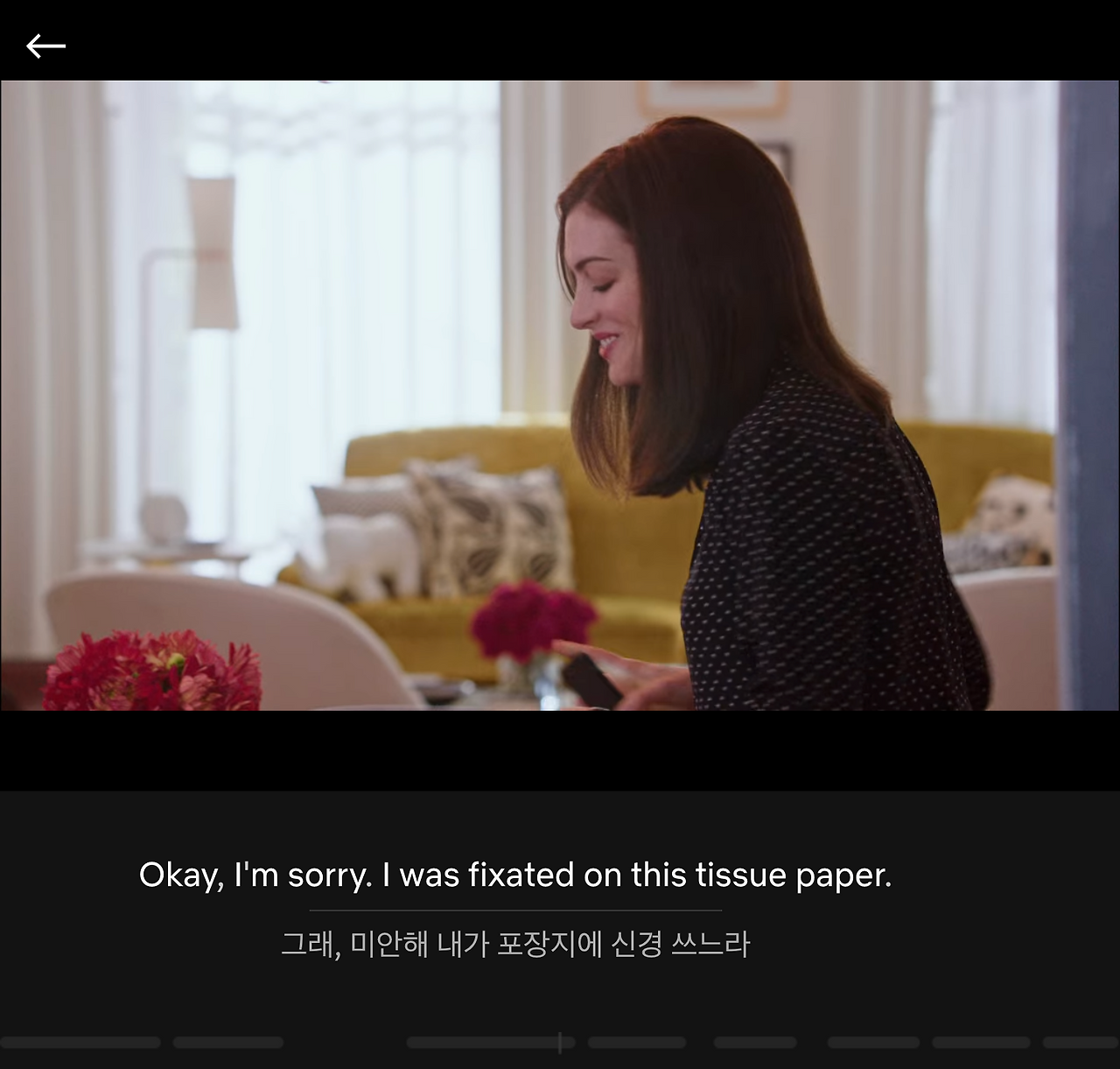 두 번째는 집착한다는 뜻보다는 '집중하다, 초점을 두다'란 두 번째 뜻으로 쓰인 장면입니다. 아내가 포장지에 신경 쓰느라고 남편의 말을 잘 못 들은 상황이에요. 무언가에 정신이 팔려있다는 뜻으로 쓰여 여기에선 '신경 쓰느라'로 번역해 주셨네요.