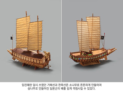 일본의 병선에는 주로 삼나무가 사용됐다. 소나무가 흔한 한국과는 달리 일본에는 삼나무나 녹나무가 많기 때문이다. 삼나무는 무르고 약하다. 이에 반해 소나무는 견고하고 치밀하며 단단한 특성을 갖는다. 소나무로 건조된 거북선은 해상에서 포격을 맞거나 접근전에 몰려도 건재했다. 특히 배와 배가 부딪칠 경우 일본의 삼나무 배는 조선의 소나무 배에 여지없이 밀리고 파손되었다. 여기에 이순신과 같은 명장의 지휘가 더해져 조선은 왜의 침략을 격퇴하는 데 성공한 것이다. 소나무 병선의 위력을 실감한 일본은 이후에도 틈만 나면 조선의 배를 탈취하려 하는 등 눈독을 들이며 조선 수군의 골치를 썩였다.