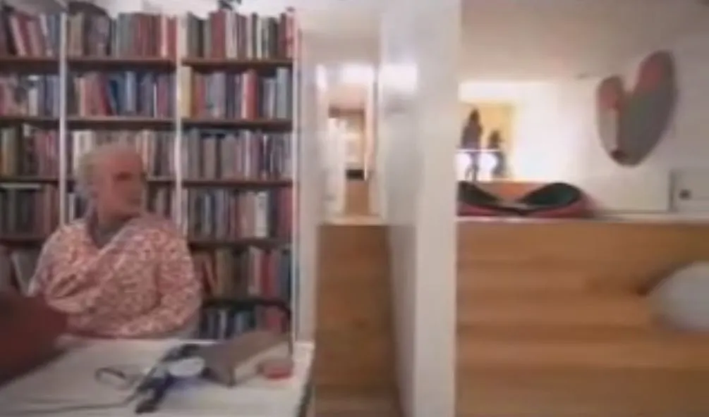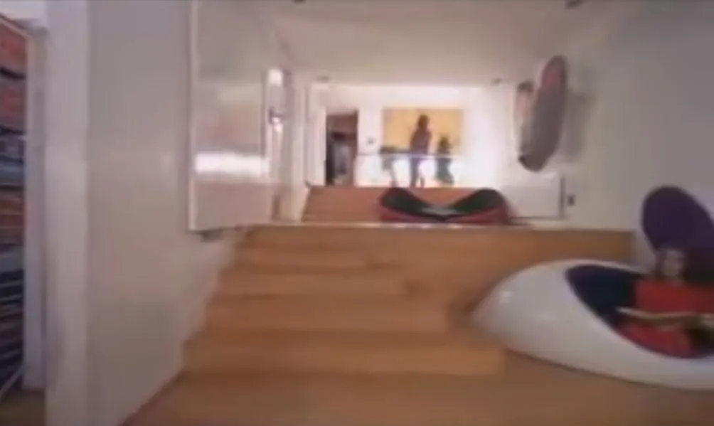 이 계단에는 미래주의적인 디자인 요소를 담고 있는 Pod chair가 보이며 아래쪽의 Pod chair안에 그의 와이프가 선홍색 의상을 입고 책을 읽고 있습니다.