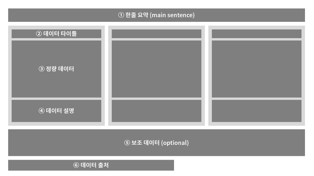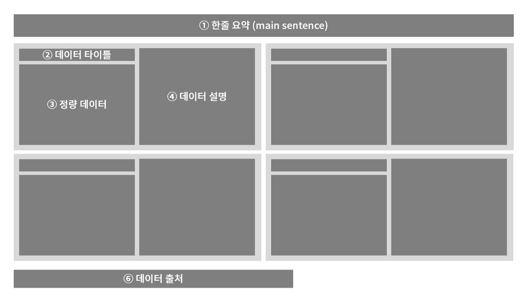 ❷❸❹로 구성되는 데이터 덩어리를 최소 3~4개로 구성하여 여러분의 논리를 전개하는 세부 데이터로 활용하는 겁니다. ❷는 자료의 타이틀 또는 세부 자료를 요약하는 문장 정도로 구성하면 좋겠고, ❸은 실제적인 주요 데이터(가급적 정량 데이터로), 마지막 ❹는 데이터에 대한 약간의 해설 정도만 붙으면 완벽합니다.