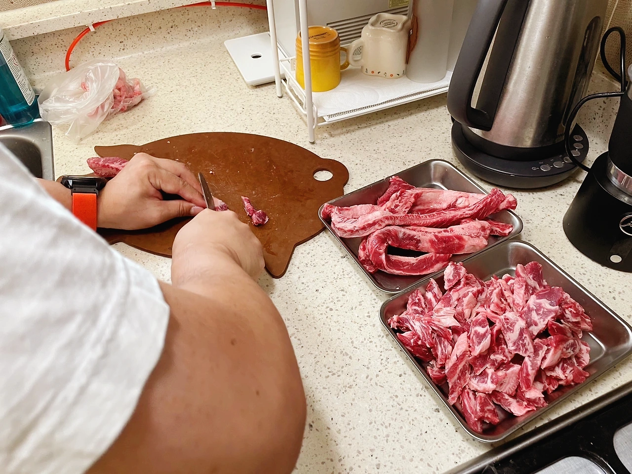 집에 와서 그 소화 안 됐던 기억을 재현해 보기로 합의하고 우린 벌크팩을 손에 쥐고 룰루랄라 집으로 돌아왔다. 오자마자 털보 아저씨(나)가 한 땀 한 땀 정성스레 고기를 손질했다.