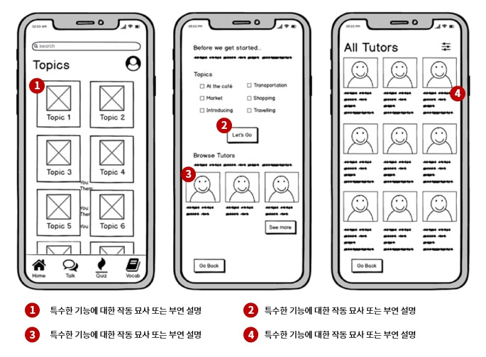 여러분이 고민해서 사용자의 문제를 해결하는데 중요한 역할을 하는 기능에 대해서는 저렇게 반드시 번호를 달아주고 부연 설명을 달아주세요. 이게 빠졌을 때 저는 그걸 '색깔 빠진 디자인이지 스토리보드가 아니다'라고 이야기합니다.