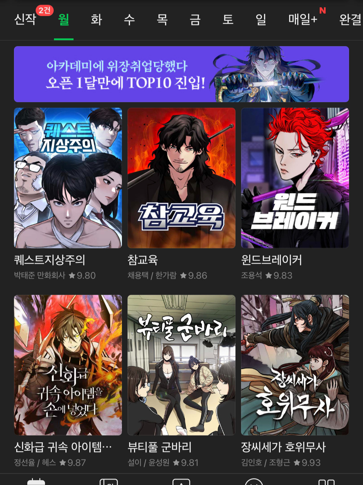 제가 요즘 뒤늦게 판타지 무협 만화에 맛을 들려서 웹툰을 자주 보기 시작했는데, 네이버 웹툰은 만화 연재 플랫폼이라면 흔하게 찾을 수 있는 클래식한 UI가 아닐까 싶습니다. 반면 카카오 웹툰은 살아 움직이는 듯한 유려함에 시각을 끊임없이 유혹하는 심미성의 끝에 도달한듯한 UI를 가지고 있습니다.