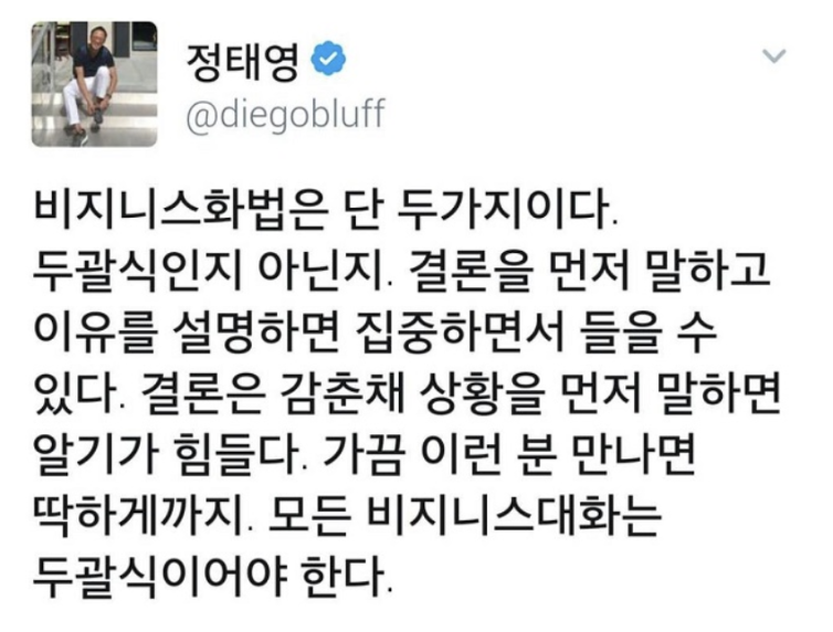 심지어는 현대가의 걸출한 인물, 2001년 현대카드가 생겼을 때 카드 시장 점유율 1.8%의 저 바닥에서 지금은 업계 3,4위를 다툴 정도로 키워낸 인물입니다. 이 양반은 더 극단적으로 비즈니스 화법엔 두괄식인지 아닌지로 구분할 정도입니다.