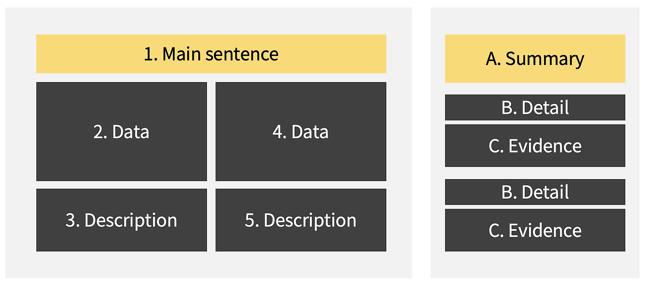 그리고 우측은 일반적인 문서형 보고서에 들어가는 양식 중 하나인데, 대체로는 상단에 요약 부분을 넣어줍니다. 그런 뒤에 이 요약에서 주장한 내용을 뒷받침하는 근거를 B~에서부터 증명하는 두괄식 형식이죠.