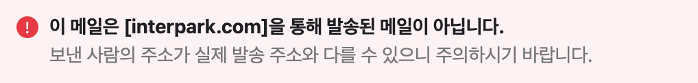 이건 다행히 정상적인 interpark 도메인으로 메일이 오면서 실제 발송 도메인과 표시정보가 다르니 주의 메시지라도 뜬 건데... 피싱범이 사칭해서 보낸 사람 정보만 그럴싸하게 넣고, 실제 발송 도메인을 이상하게 임의로 보내는 피싱 메일이라면?