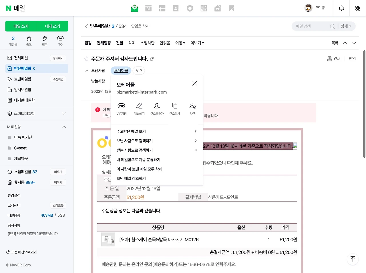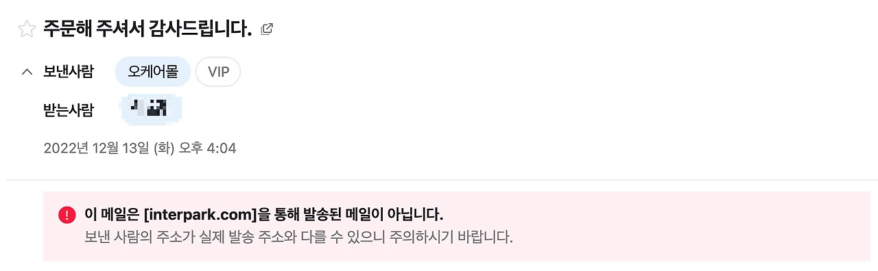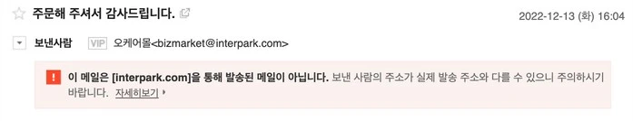 이게 오케어라는 서비스에 입점된 앱 인몰 형태의 쇼핑몰인데, 쇼핑몰 솔루션은 인터파크에서 제공하는 건지 결제 완료 피드백을 인터파크 도메인으로 발송하더군요. 그런데 실제 메일 발송인이 인터파크 도메인이 아니다 보니 메일 상단에 요런 주의문구가 떡하니?