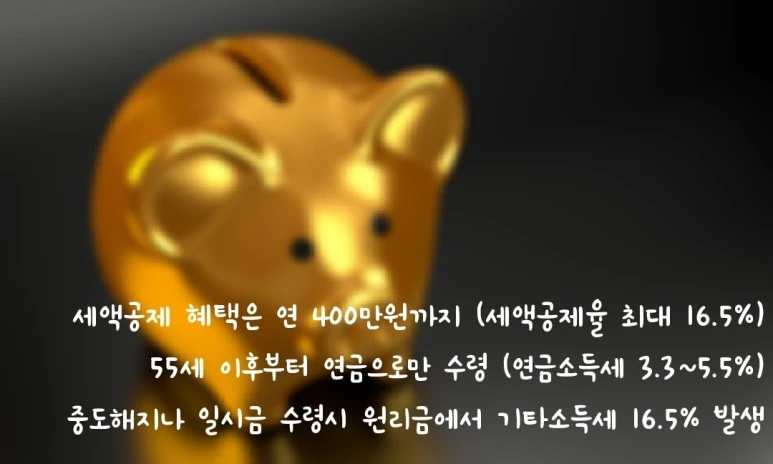 중도해지할 경우에는 원리금의 16.5%의 기타 소득세가 부과된다. 결국 내가 혜택 본 세액공제는 다시 뱉게 되는 셈이다. 수익이 생겼다면 수익까지 합친 금액의 16.5%이기 때문에 꼭 알고 있기를 바란다. 결국 나중에라도 해지하거나 일시금으로 지급을 받는다면 절세 효과가 큰 의미는 없을 수 있다.