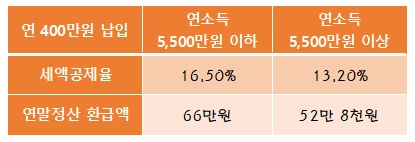 위와같이 연 소득 금액에 따라 공제 비율이 다르다. 대부분은 16.5%의 세액공제를 받을 수 있을 것이다. 추후 소득이 늘어나면 13.2%로 줄어든다.
