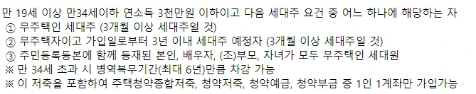 만 34세 이하 연 소득 3천만원 이하이고 무주택 세대주 관련 3가지 사항 중 한 가지에 해당하면 가입이 가능하다.