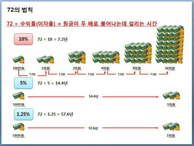 72의 법칙이라고 나의 원금이 2배가 되기까지 걸리는 기간을 계산할 수 있는 방법이 있다.