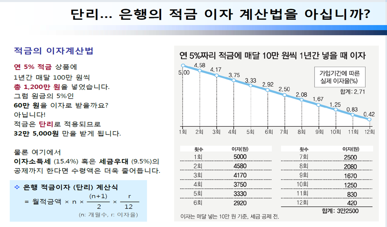 "적금 금리는 '단리'로 적용된다" 매달 내가 납입하는 금액에 대해서만 이자가 붙는 것이다.