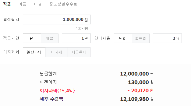세후 수령액은 12,109,980원으로 나의 순수 이자액은 109,980원으로 나온다. 만족할만한가?