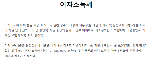 금융상품의 이자에 대해서는 이자소득세가 발생하며, 기본적으로 '15.4%의 이자소득세'