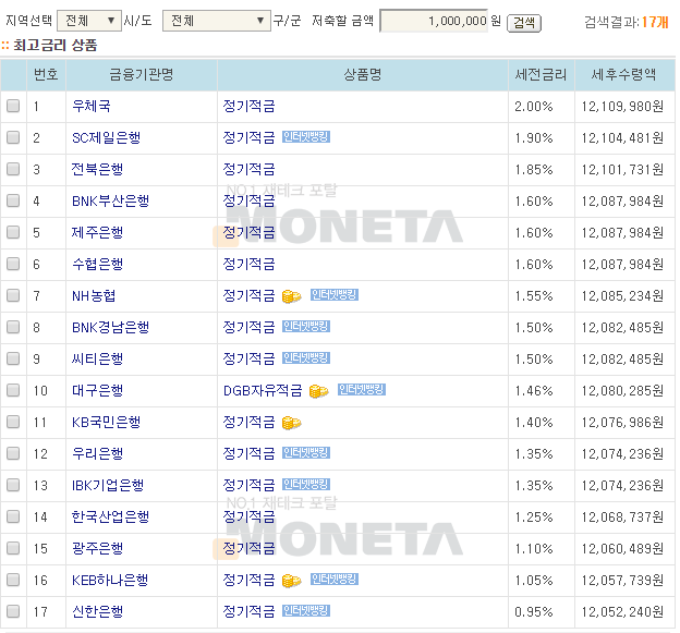 월 100만원 적금시 금일자 은행 적금이율이다. 최고 금리가 우체국의 적금상품으로 세전 2.00%이다.