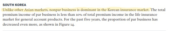 한국 보험 시장에 대해 언급한 파트를 보면 '다른 아시아 마켓과 다르게..'라고 시작하며 다른 국가와 다르게 무배당 상품이 지배하고 있는 특이한 점에 대해 언급하고 있다.