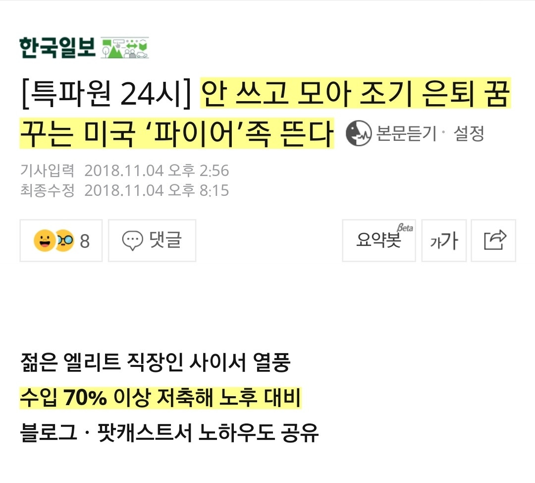 월급은 오르지 않고 집값은 끊임없이 치솟고 결혼이나 출산을 포기하는 젊은이들은 늘어나고 이미 고령화 시대에 접어들어 기댈 곳이 없는 이런 불확실한 시대에 파이어족 열풍은 결국엔 살아남기 위함이고 행복을 추구하기 위함이 아닐까? 미국이나 우리나라나 각자의 삶 속에서 행복을 추구하고 싶은 것은 동일하다.