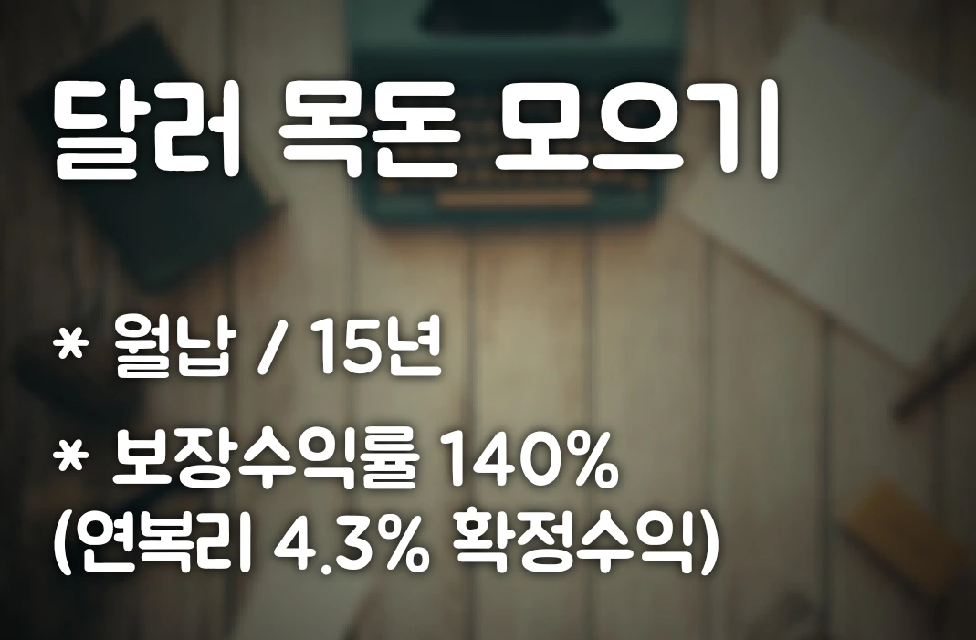 달러 자산 모으기 - 확정 저축 (확정이자 140%) 최저 연 복리 4.3% 달러 상품 활용 | 목돈을 만들기 위한 저축 상품을 가입하거나 고려할 때 선호하는 사항은 안정적이면서 만족할만한 수익률일 것이다. 이번엔 해외 금융의 확정 이자 상품인 달러저축에 대해 얘기해보려 한다. 이 상품은 매우 심플하여 이해하기도 쉽고 그만큼 매력적인 상품이며, 지속적으로 달러 자산을 모아야 하는 시대에 상당히 괜찮은 방법이라고 생각한다. 15년 만기 확정 이자 1