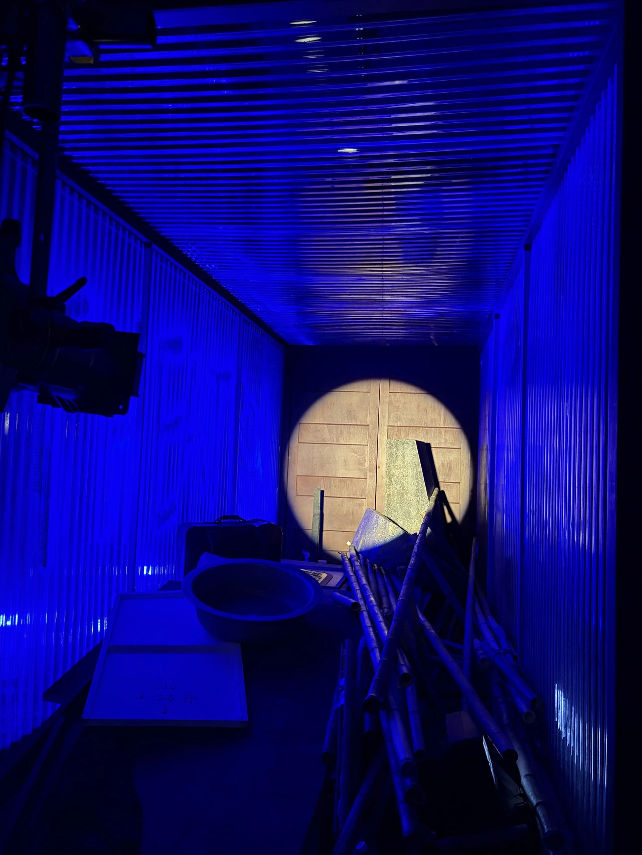 허름한 컨테이너 속에는 작년에 한 연극 공연에서 사용되었던 무대 세트가 해체된 채 방치되어 있고, (작가 신나경 작품)
