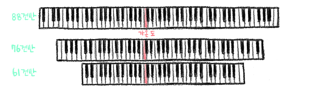 디지털 피아노의 경우 건반의 개수의 차이가 있습니다. 아래의 그림과 설명처럼 3가지로 나뉘는데요. (호.... 혹시 다른 수의 건반도 보신 분 있으시면 알려주세요!)