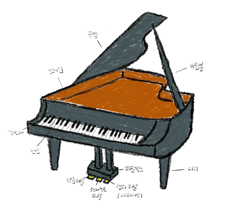 그랜드 피아노는 콘서트 연주용으로 보통 사용됩니다. ‘해머’라는 것이 밑에서 현을 두드린 후에 다시 중력에 의해 되돌아오는 구조로 소리를 낸다고 합니다. 건반과 피아노 줄이 수평(그래서 뒤로 긴가 봅니다!)으로 되어있고 가장 울림이 좋고 음색이 풍부한 피아노입니다. 저는 실제로 연주해본 적이 없어서 경험해보지는 못했지만 건반을 누를 때 느낌도 좋다고 합니다. 나중에 한번 꼭 눌러봐야겠습니다.
