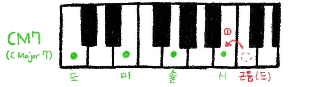 다음으로는 Major코드에 대해 알아보아야겠죠? 저는 처음에 7th코드와 같은 줄 알았지만, 다른 코드입니다. 단 7도의 음이 아닌 장 7도의 음을 더해 4개의 음으로 이루어진 코드가 Major 7th 코드입니다. 7th 코드의 제7음을 반음 더 올린 것으로 생각하셔도 됩니다. ‘CM7’과 같이 대문자 M과 숫자 7을 이어서 표기하는 코드를 Major 7th 코드라고 합니다. 장 7도의 음이기 때문에 이 번에는 한 칸 내려오는 음을 추가하면 됩니다. 아래 그림과 같이 만들어주시면 됩니다! 쉽죠?