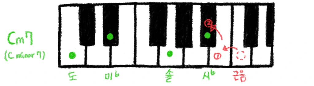 이 코드는 ‘Cm7’과 같이 소문자 m과 숫자 7을 이어서 표기하는 코드입니다. 코드를 만드는 법은 아래 그림과 같습니다.
