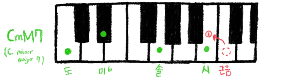 마지막은 오늘 배울 코드 중에 가장 이름이 긴 코드입니다. Minor Major 7th 코드는 이름이 길어서 복잡하다고 느끼실지도 모르겠지만, 실제로는 그렇게 어렵지 않습니다. 그냥 7th 코드와 Major 7th 코드의 차이처럼 Minor 코드와 이 코드의 관계가 같다고 생각하시면 될 것 같아요. 그래서 마이너 코드의 근음으로부터 장 7도의 음을 더한 4개의 코드로 이루어지는 것이 이 Minor Major 7th 코드입니다. 표기는 이쯤 되면 다들 짐작하시겠지만, ‘CmM7’과 같이 소문자 m과 대문자 M을 나란히 표기해주면 됩니다. 만드는 법은 아래 그림을 참고해주세요.