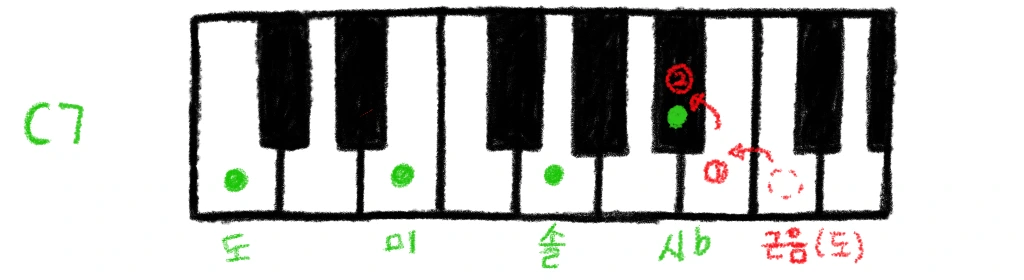 본론으로 돌아가 첫 문장에서 얘기했던 것을 이어서 설명드리면, 저는 스케일을 다 숙지하기엔 수준이 너무 낮습니다. 외우기도 힘들고.... 그래서 쉽게 7 코드를 만드는 법을 찾아보겠습니다. 이미 피아노를 치시는 많은 분들은 알고 계신 방법이 아닐까 싶은데요. 예를 들어 ‘C7’ 코드를 만든다고 하면 C 코드의 근음인 ‘도’에서 두 칸 내려오는 음을 추가하는 방법입니다.