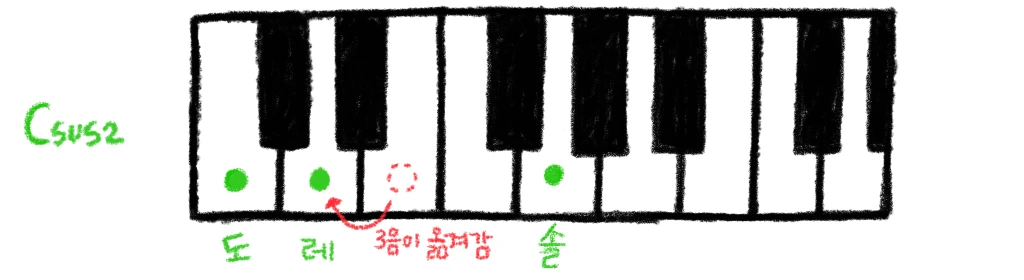 예를 들면 C, E, G로 이루어진 C 코드는 Csus2에서 C, D, G가 됩니다. 간단히는 아래 그림을 참고해주세요!