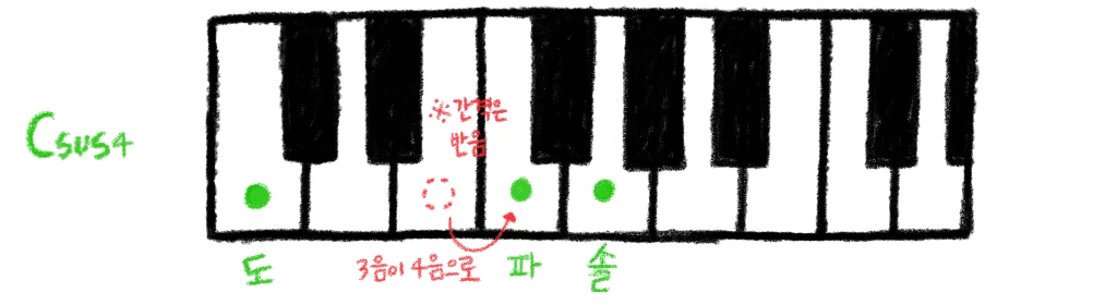 본론으로 돌아가 이번에는 sus2, sus4를 배워보고자 합니다. 피아노 연주에서는 잘 안 쓴다는 이야기도 있던데, 그래도 저는 왕초보로서 이론 학습을 위해(?) 배워 보고자 합니다.