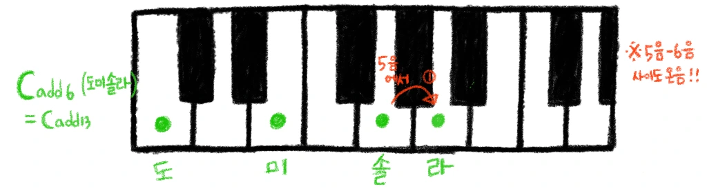 Add코드 만들기도 이제 6=13 코드를 배우면 마무리입니다! 사실 이 코드는 많이 쓰이지는 않는 것 같지만 이왕 배우는 거 다 배워두면 좋지 않을까요? 아! 그리고 13 코드는 마이너 코드에서는 존재하지 않습니다! 자세한 내용은 역시나 아래 그림을 참조해주세요^^