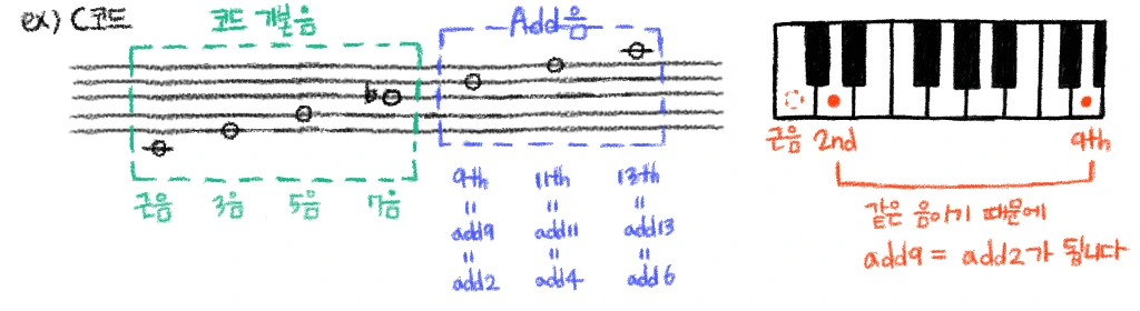 왜 다른 음은 추가될 수 없어요? 하시는 분도 있으실 텐데요. (저는 그런 궁금증이 들었.... 습니다) 예를 들어 ‘add1’이라 하면 1도의 음을 더해야 하기 때문에 이미 코드 안에 근음으로 존재하고 있는 음을 다시 더하라는 얘기가 되면서 성립할 수 없게 되죠. 이와 같이 add3, add5도 존재할 의미가 없어지게 됩니다.